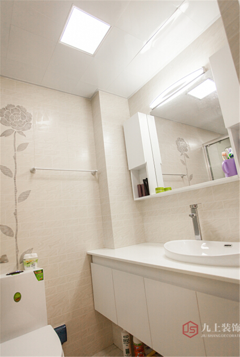 衛(wèi)生間在人工照明上做的比較明亮,淺色磚紋,秀氣的花形,簡單中體現(xiàn)不同。