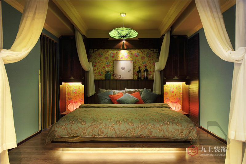 臥室淺綠色基調,搭配各色花紋的燈飾 床單,以及特色的荷葉吊燈,宛如置身叢林,花香四溢。