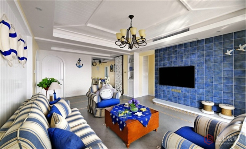 客廳家具以藍(lán)色+白色為主,電視墻采用灰藍(lán)色的瓷磚,好似汪洋大海,海上還有兩只白色的海鷗。