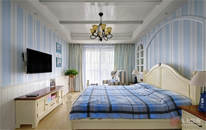 臥室墻紙為淺藍(lán)色豎條紋,與條紋窗簾非常搭配。窗邊的綠植給私人空間帶來(lái)新鮮的氣息。