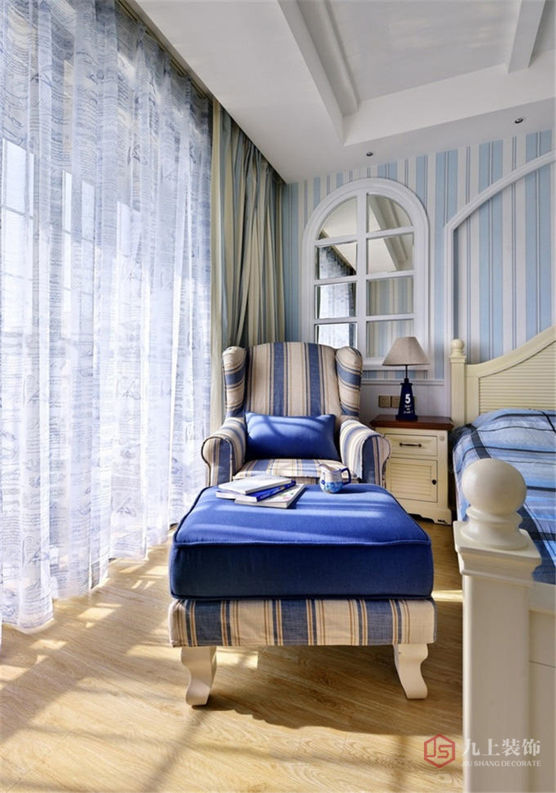 陽(yáng)臺(tái)邊的沙發(fā)椅和沙發(fā)凳與床上用品的顏色也十分搭配。床頭柜上方的鏡子做成拱形窗戶的樣式,具有地中海風(fēng)情。