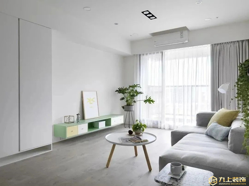 木質地板散發清新質感,懸浮式電視柜采用飽和度較低的綠色,可愛活潑