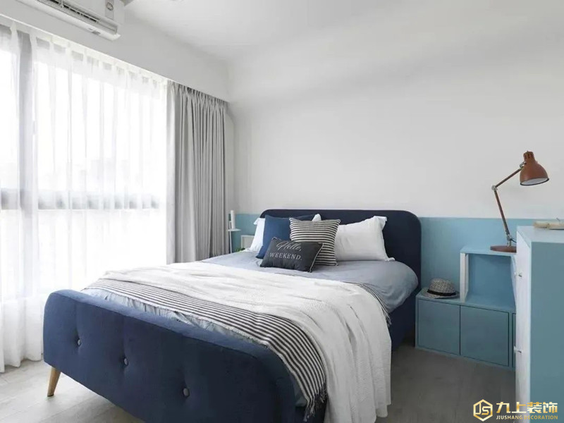 主臥主色調以白色為主,藍色作為跳色,兩種色彩的拼接碰撞將臥室空間劃分開來,豐富了臥室色彩的層次感。藍白拼色一體化書桌為房間主人提供了學習辦公之地。