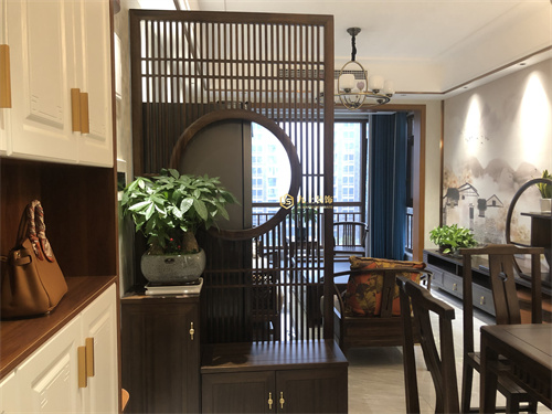新中式風格結(jié)合中式和現(xiàn)代元素,既體現(xiàn)中式的沉穩(wěn)大氣,又不失現(xiàn)代特色,是現(xiàn)今比較流行的風格。玄關(guān)從視覺上來看,對戶外的視線有屏障作用,不至于開門見廳,讓人一眼就看客廳內(nèi)情形,既保護隱私又美觀。新中式和中式的效果主要靠家具和軟飾,家具選用實木家具,但不失現(xiàn)代特色,很好的體現(xiàn)了新中式的特點。