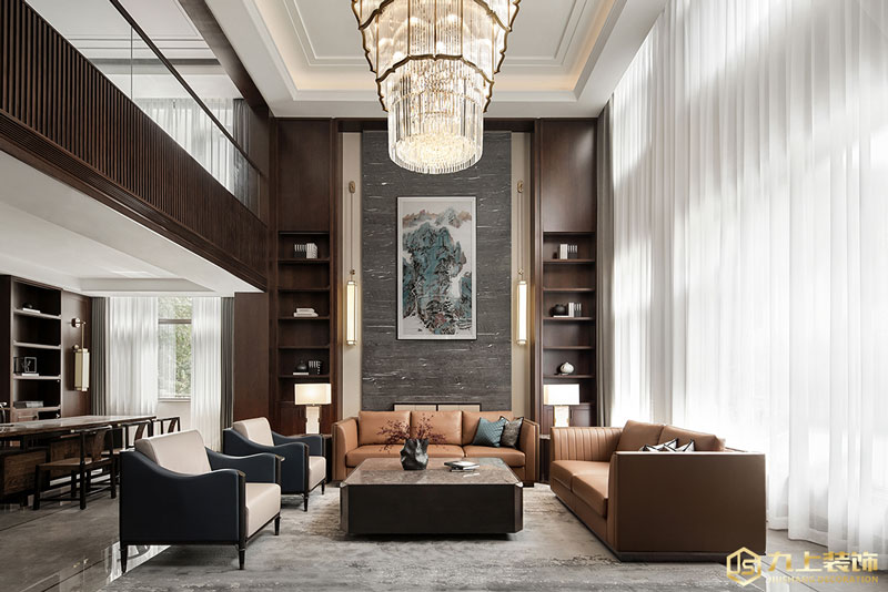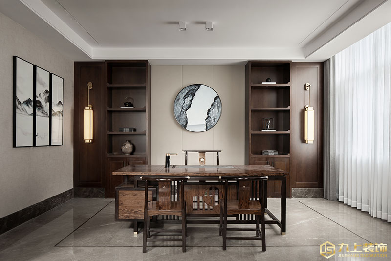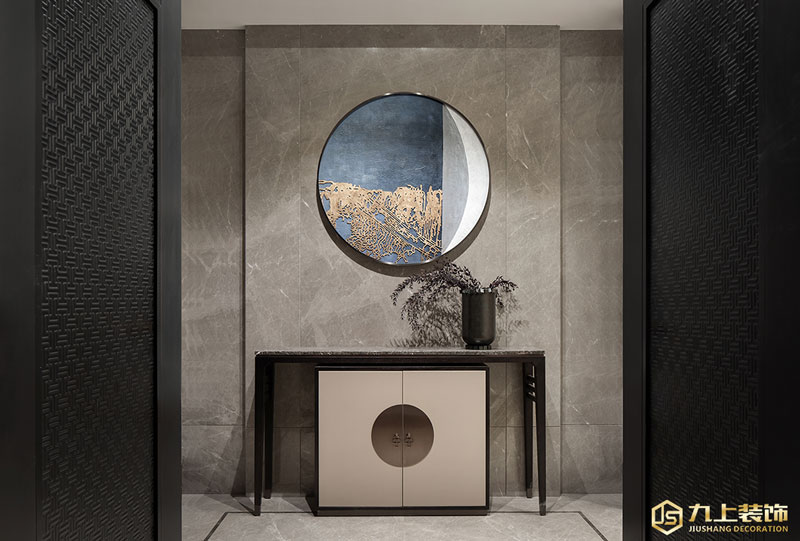 工整、利落的線條有著與生俱來的秩序感,圓形裝飾畫點綴其中,營造出幾何藝術(shù)感,粗曠的畫質(zhì)面帶著寫意的山水脈理,不經(jīng)意間傳達(dá)出東方大宅的意境之美。