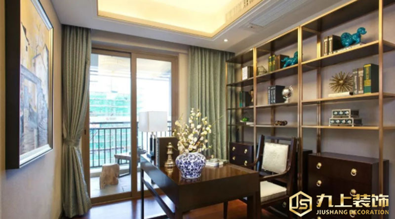 書房是主人讀書和寫作的空間,注重獨處的神秘感。墻面正中央點綴意境深遠的水墨畫,給此空間增加了文人氣質(zhì)的中式力量,以及搭配質(zhì)感奢華的擺件、實木儲物柜與金屬書架的高度融合,達到靜逸微妙的空間