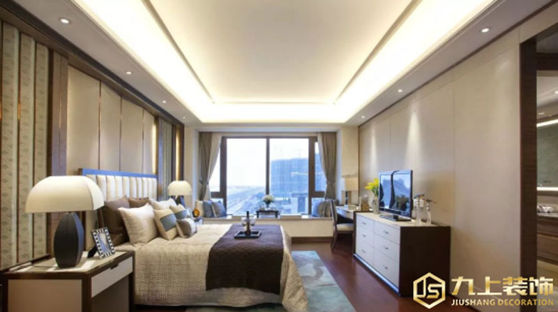 臥室,借助直線的運用,以更加現(xiàn)代輕盈的形態(tài)呈現(xiàn)。金屬線條與自然、個性紋樣相間,在射燈的照射下讓大地色的背景墻簡潔但不單調(diào)。黑白相間的實木柜,深色飄窗案幾、淺色抱枕以及床上擺件,通過不同的肌理觸感、個性。