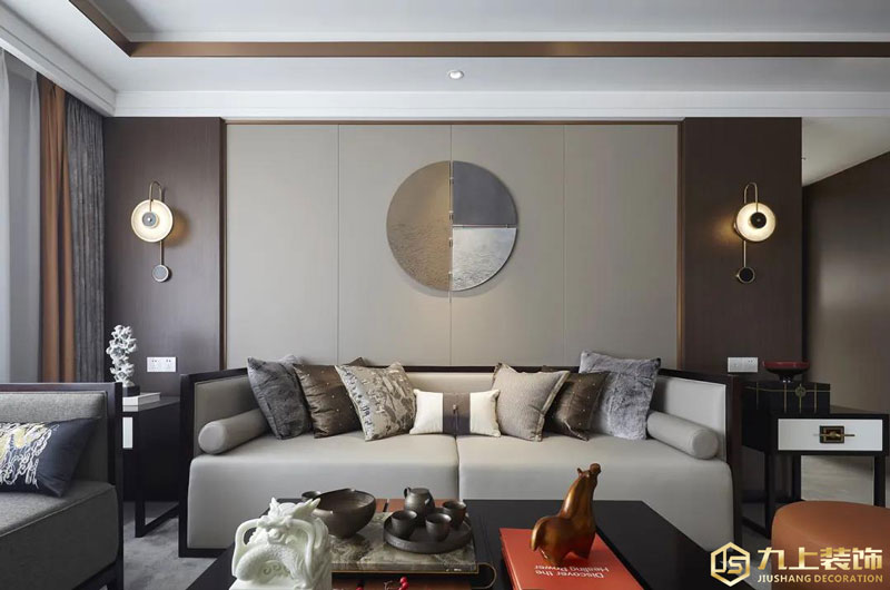 沙發墻中間區域是灰色硬包、兩側是木飾面的材質,布置上一套灰色皮沙發,黑色茶幾上布置禪意精致的茶具與擺飾品,也使得空間充滿華麗端莊的高檔氛圍。