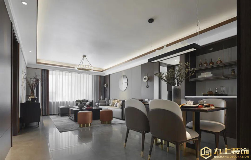 客廳空間整體現代時尚+東方意境的設計氛圍,整體空間布置優雅中帶著復古范的氣息,在門套線、踢腳線與天花四周加入金屬材質的裝飾,布置上橙色的圓形鼓凳,也讓空間顯得更加優雅華麗而時尚。