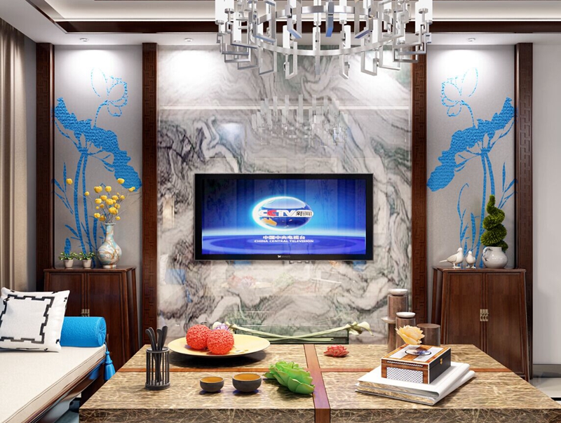 客廳效果圖最具代表性的裝飾主要體現在電視背景墻的造型處理上,主要運用了中式風格中的傳統角花和中式花格裝飾。