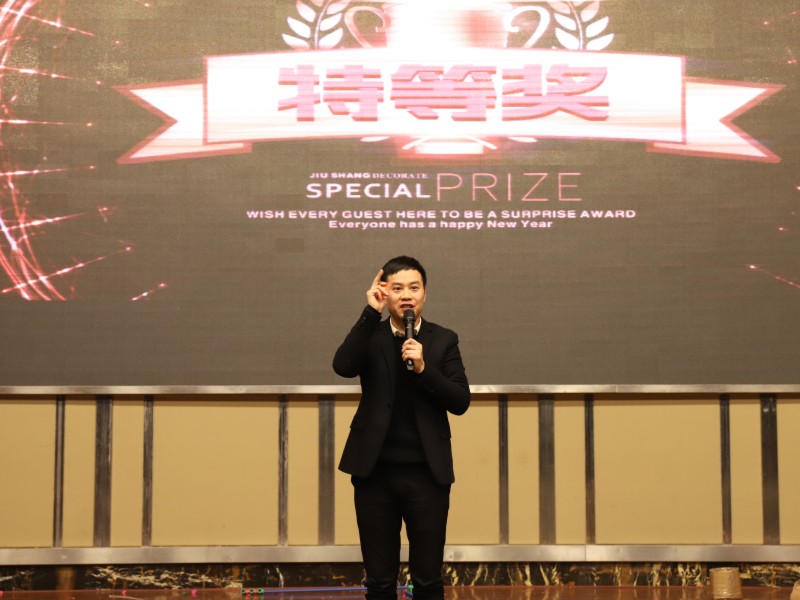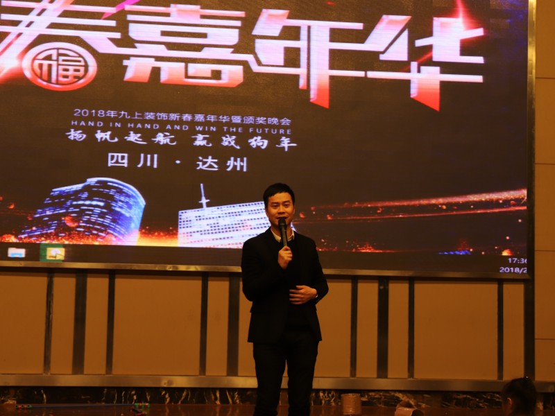 九上裝飾總經理唐渝豐先生賀詞中說道:緊張忙碌的2017年已經過去,公司在領導班子的帶領下,在全體員工的努力下,取得了優秀的成績??偨浝硖朴遑S圍繞“新起點 新跨越與智者為伍,與良善同行,解讀九上的發展、現狀和未來,給全體員工帶來力量和信心。
