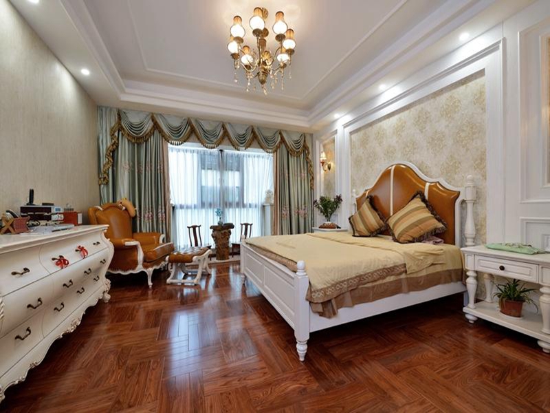 現代美式風格,追求華麗、高雅的古典風格。居室色彩主調為白色。家具為古典彎腿式,家具、門、窗漆成白色。擅用各種花飾、豐富的木線變化、富麗的窗簾帷幄是西式傳統室內裝飾的固定模式,空間環境多表現出華美、富麗、浪漫的氣氛。