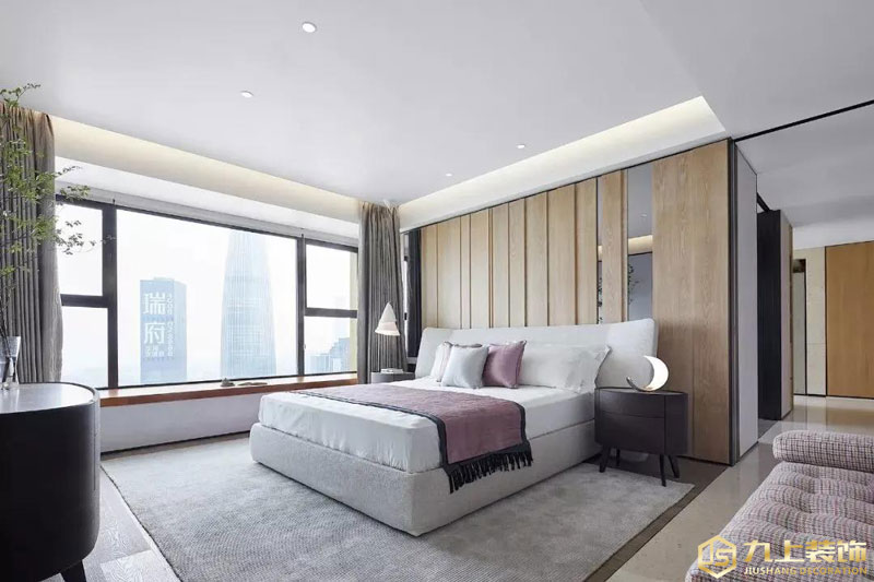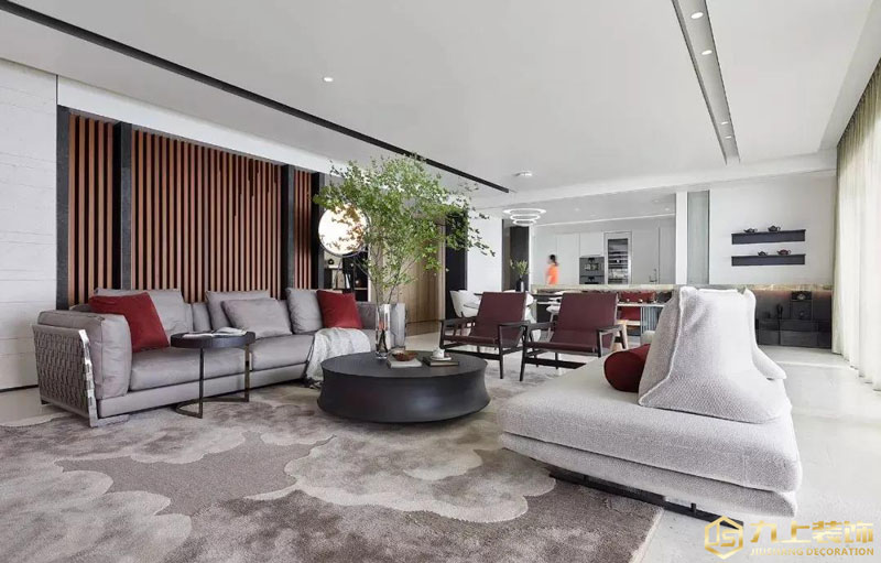 客廳天花吊平頂的基礎,加入線條性的燈帶,帶來一個簡潔大方的無主燈設計效果,客廳取消以電視墻為重點的設計,沙發對沙發的布置,中間加入黑色的圓茶幾,到灰色調的地毯,一瓶吊鐘綠植裝飾,布置簡雅禪意的軟裝細節,讓空間顯得高級優雅。