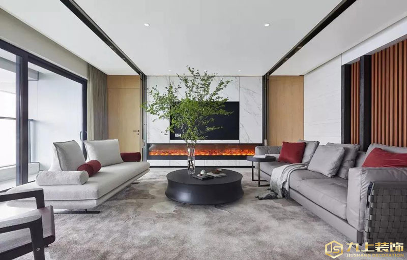 客廳電視墻兩側木飾面+中間大理石的對稱造型設計,電視下方加入壁爐設計,中間壁掛電視機,整體保持一個簡潔時尚的高級視覺。