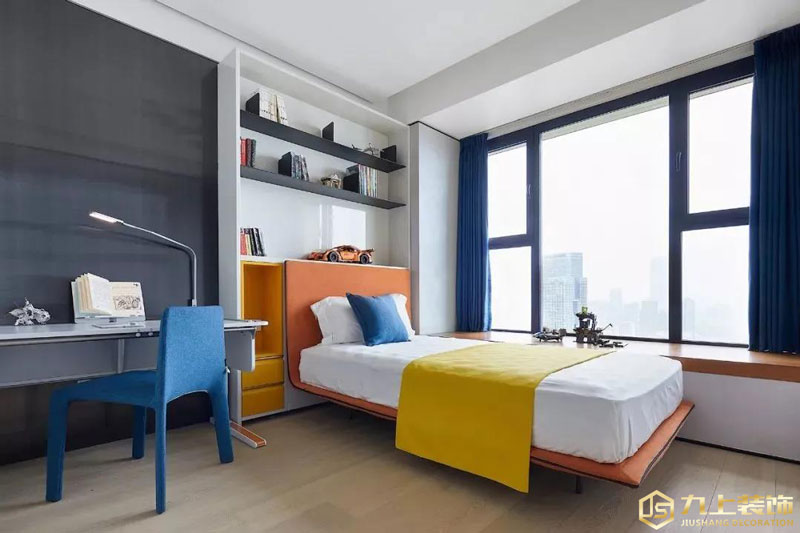 兒童房在靠飄窗位置布置一張橙色床鋪,床頭加入矮柜+書架設計,搭配黃色+白色的床鋪,提供了一個活潑鮮艷的工作空間。旁邊布置一張書桌搭配藍色的凳子,整個空間的配色有藍黃橙,顯得活潑也有鮮艷。