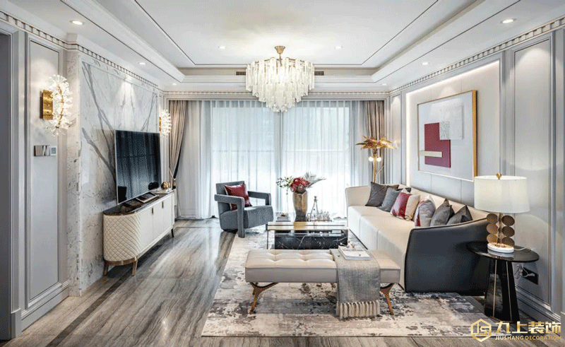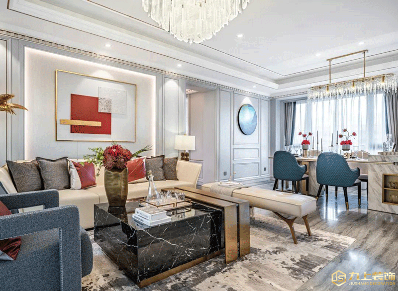客廳在純白色的主基調上,用明亮的色彩與金屬材質進行調和與碰撞,增加空間的趣味性。