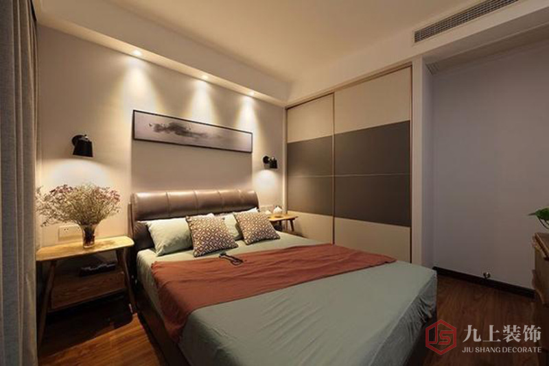 主臥則是更多的表達(dá)一種靜謐的氛圍,本案例中臥室取消了主燈,選擇在床頭對稱裝上壁燈,配合燈光在點(diǎn)與線的處理方式營造一種舒適溫馨又神秘的居住氛圍。