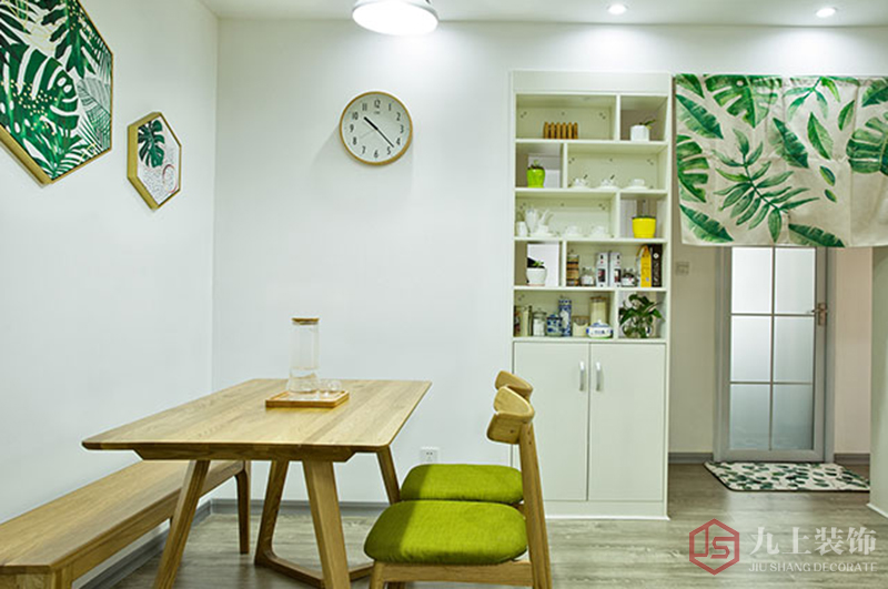 玄關對面就是餐廳,原木餐桌和墻上的綠葉壁畫帶來一種古樸氣息,自然之美。綠色調節人的心情,下班回來首先看到綠色家居讓自己放下疲憊,輕松進家門。