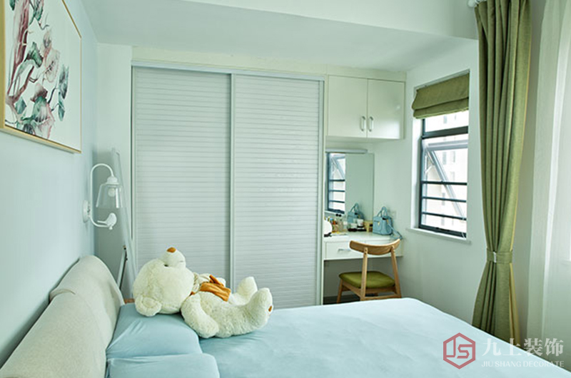 小小梳妝臺,在綠色窗簾的映襯下,顯得小巧但不失精致。