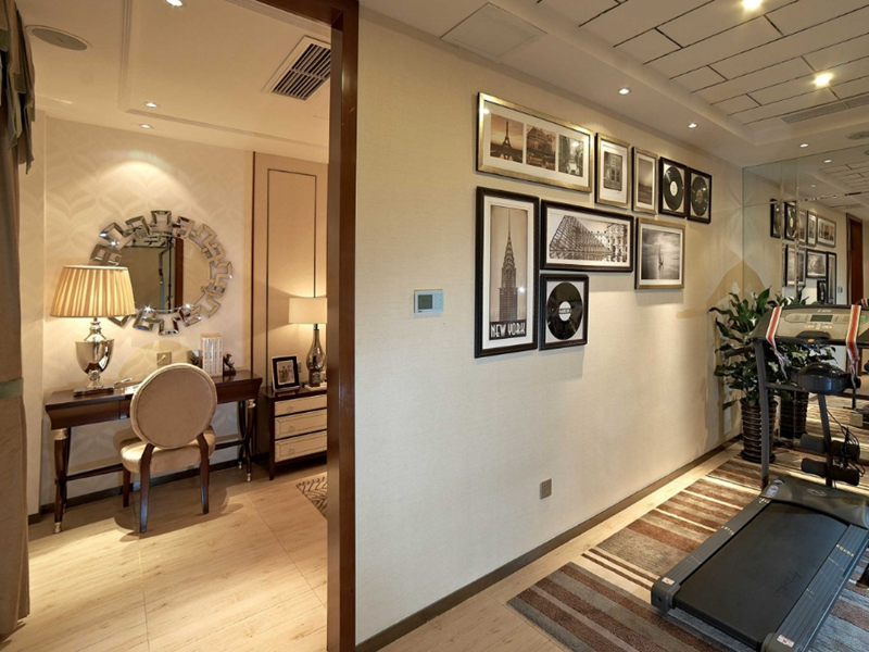 健身房的整體照片墻賦予展示功能,男女主人將旅途中的美景收藏,仿佛居于室內(nèi)也是一直行走在路上。整面鏡子的鋪設(shè),從視覺上擴(kuò)大了整體空間,給平淡的空間增添許多的愜意氛圍。