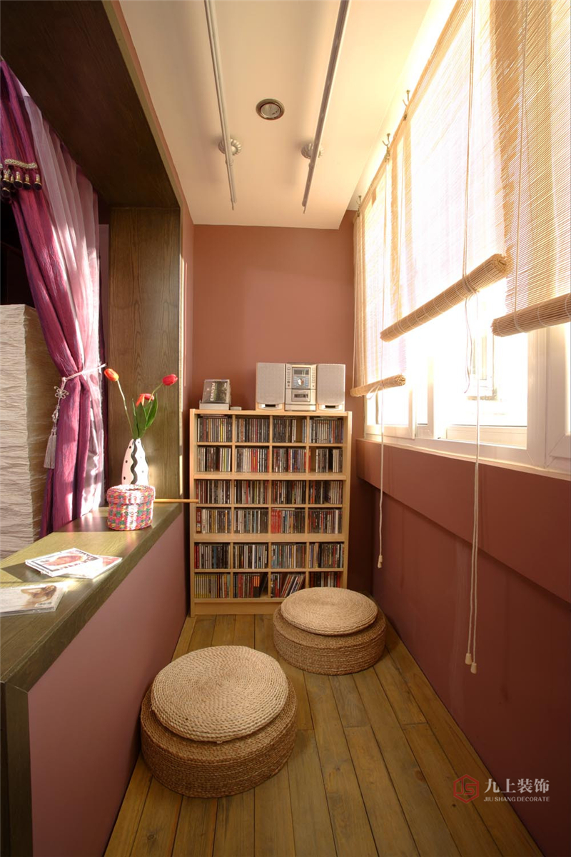 陽臺改造成了私密性極高的書房,暖暖的陽光,以及淺色的書架和地板,尤其手工榻榻米坐墊,使環境舒適悠閑。