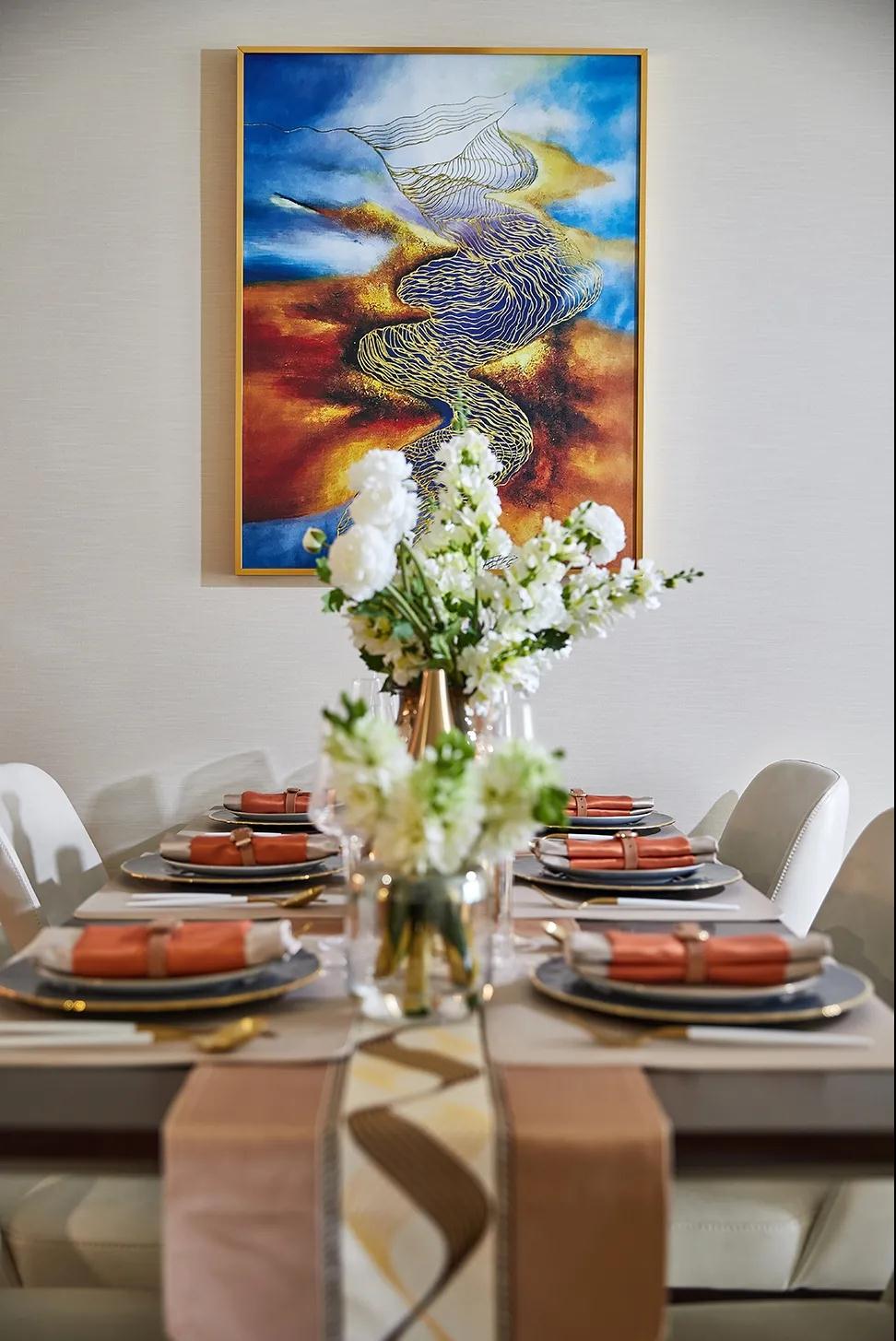 餐廳金沙藍(lán)海交疊中,河流脈絡(luò)交纏,傾流而下。方正餐桌上,圓盤方巾中,靜靜藏匿調(diào)色盤的裝衣描畫。