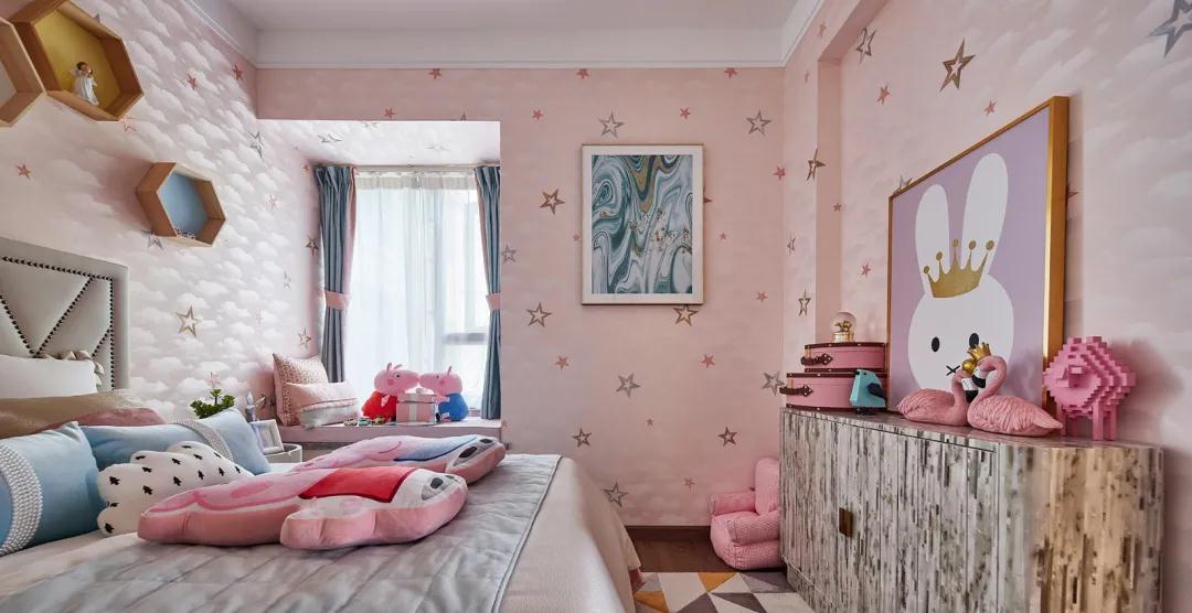 兒童房象征新生的粉色層疊入眼,兒童房的設(shè)計(jì)守護(hù)一顆純凈的少女心。云朵連綿,如墻面的繡畫,在陽(yáng)光的折射下,天光云影,接連一色。