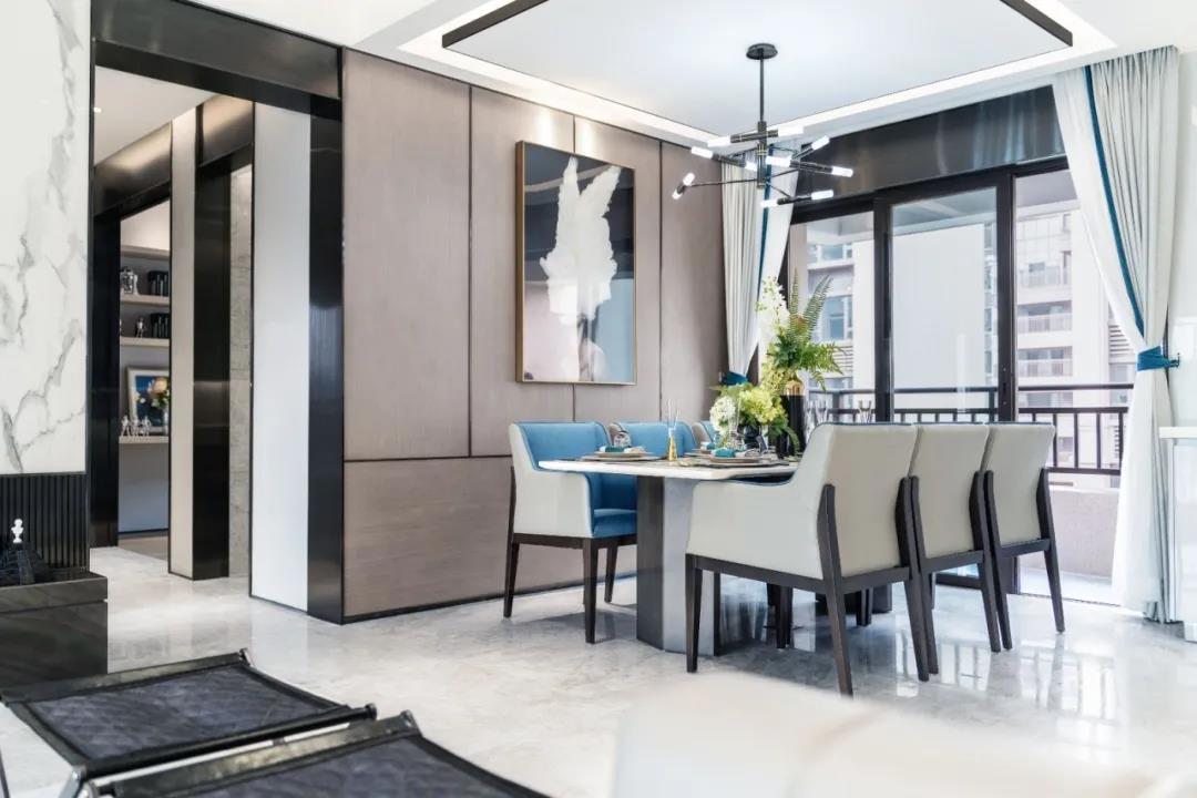 餐廳擁有絕佳采光的餐廳中,一桌、一椅,均凝聚著空間的形與神,見證著戶外庭院的四季交替。深沉的藍色餐椅,喚醒餐廳的活力。綠植的點綴,營造舒適自然的氛圍。