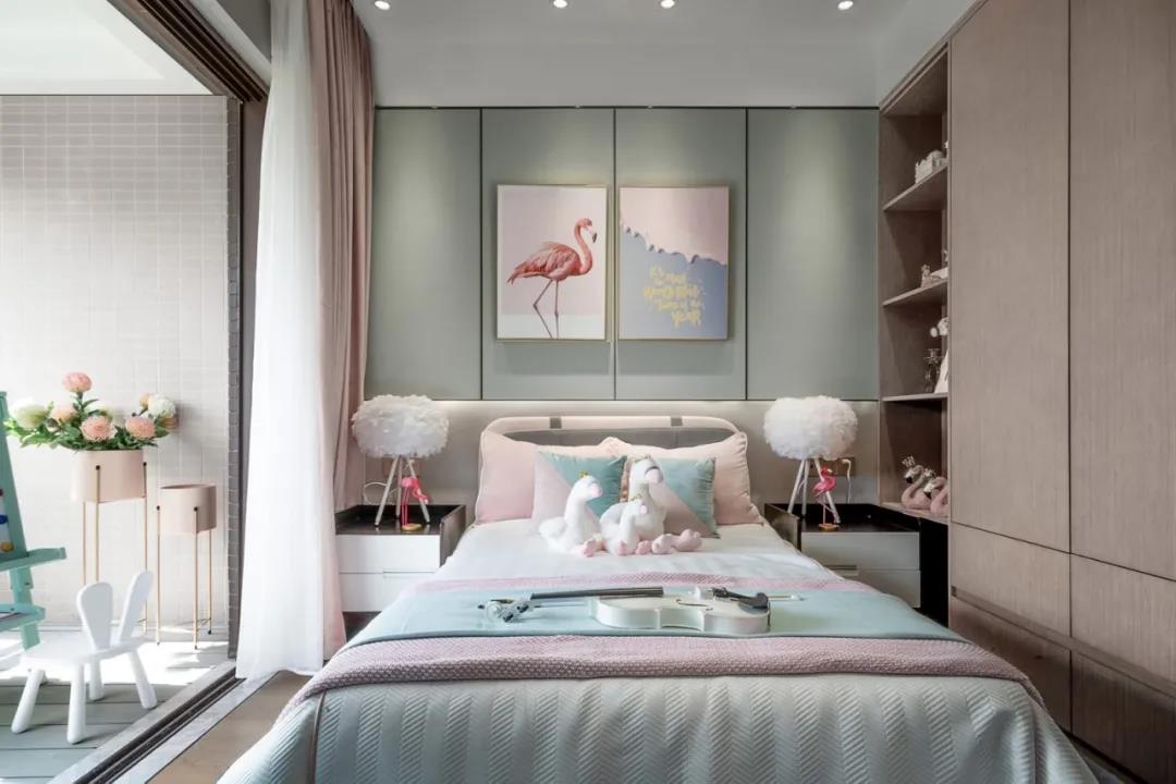 兒童房女孩房以鶴姿立意,大到臺燈,小到掛畫擺件,無一不寄托著主人的情思,淺淡的粉色、綠色,透漏出柔情和細膩,在日光的暈染下更加溫婉可人。