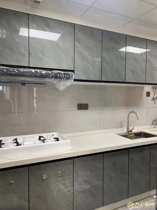 廚房,淺藍色的櫥柜與墻地磚搭配,簡潔利落方便打理