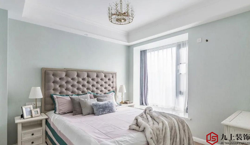 主臥選用棕色家具,調和淡色空間,使得空間層次感更強,整體優雅柔和,且很好的延續空間調性,不經意間展現出別樣的美式風情